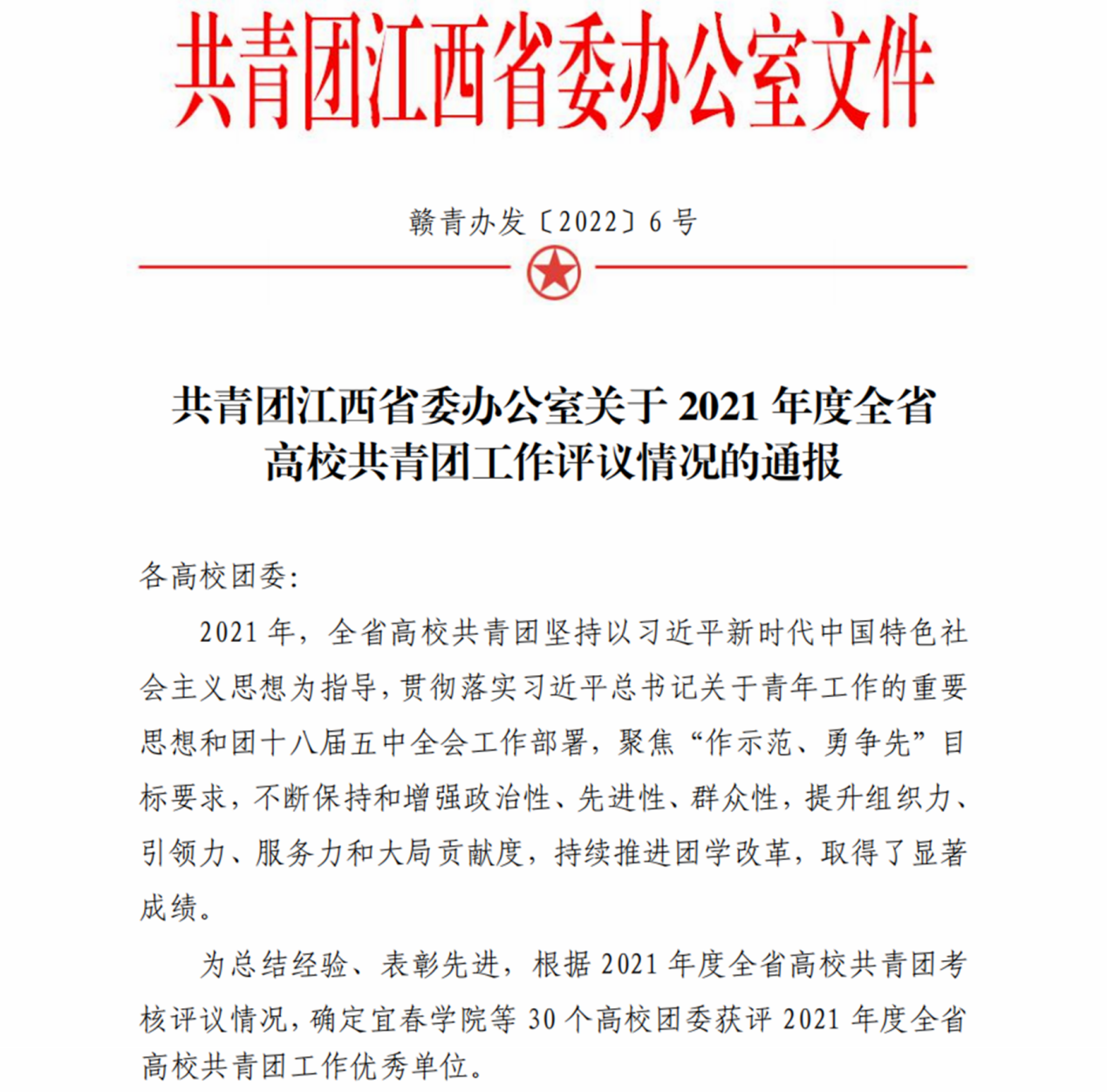 九江职院新闻网讯(校团委 于永辉)近日,共青团江西省委下发了《关于2021年度全省高校共青团工作评议情况的通报》,我校获评全省高校共青团工作优秀单位。